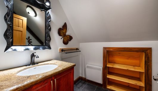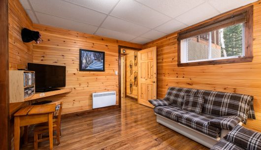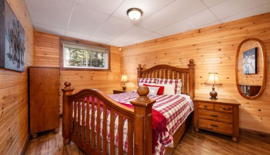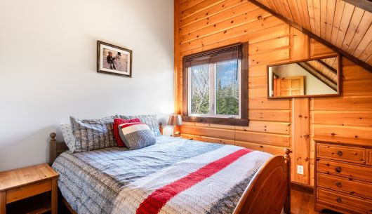 Idéal pour 8 personnes, le chalet compte 4 chambres, 3 salles de bain, air climatisé, une salle de jeux, une salle de télévision avec écran plasma 50 pouces, une cuisine toute équipée et un salon munis d’un beau foyer à combustion lente. Les planchers de l’étage principal et de la mezzanine sont en bois franc. Celui du sous-sol est chauffant pour votre confort. C'est l'endroit rêvé, pour se retrouver en famille ou entre amis.